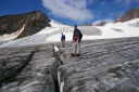 Am Kesselwandferner ist die Spaltengefahr relativ gering – man sieht nur ein paar Risse – mehr nicht. Wir sind aber trotzdem am Seil gegangen. Sicher ist sicher.