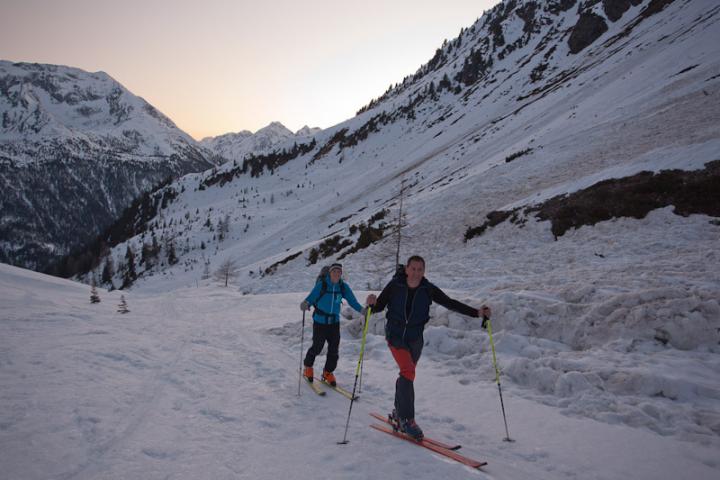 Die Abfahrt hatte alles zu bieten, im oberen Teil guten Pulver, dann ab dem Zwieselsbachjoch abwechslend Pulver, Firn und verharschte Passagen. Nach einer kurzen Stärkung auf der Schweinfurterhütte folgten wir dem Weg nach Niederthai. Dieser ist noch durchwegs ohne Problem zu befahren.