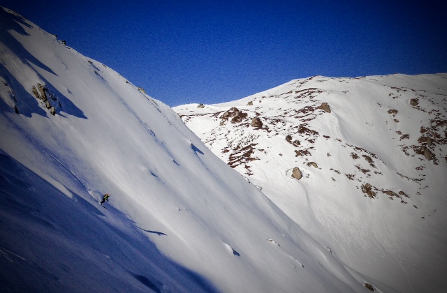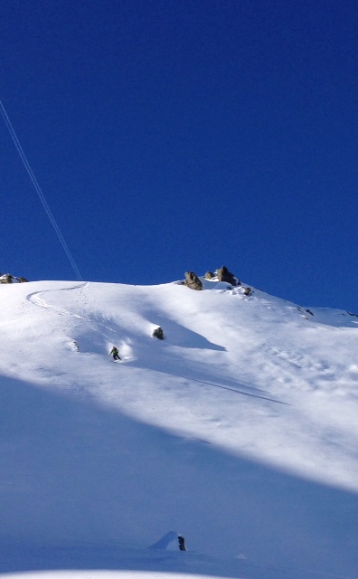 Pulver fanden wir „fast“ keinen mehr doch der obere Teil versprach unberührte Hänge mit ganz respektablen Verhältnissen. Ab der Hälfte zeigte dann die Wärme das wahre Gesicht: Bruchharsch und Sulz vermischten sich zu einem anständigen Kraftakt. Trotzdem alles in allem ein lohnendes Erlebnis.