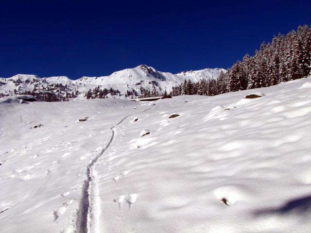 Wenn man nach dem schmalen Steig wieder auf die Forststraße zur Bamberger Hütte trifft, wendet man sich rechts in richtung Manzenkar (da fahren auch die meisten vom Schafsieel runter). Gottseidank war vor mir noch irgendjemand unterwegs, sodass ich mir das Spuren sparen konnte. In der Kelchsau hats nämlich geschneit und gar nicht wenig. Auf einem harten Untergrund haben sich über Ostern 10-15 cm pulvriger Neuschnee angesammelt (Â
